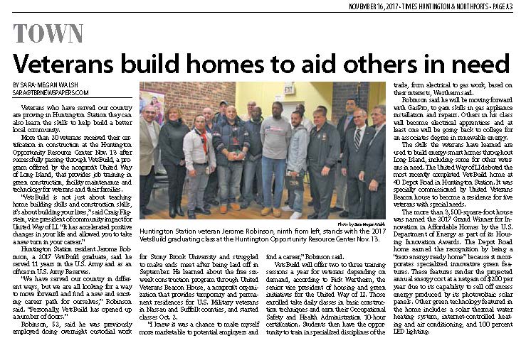 For the third straight year, United Way of Long Island has been named the Grand Winner in the Affordable Homes Category of the U.S. Department of Energy's Housing Innovation Awards. On November 13, United Way held a ribbon cutting ceremony to commemorate this achievement, and celebrated the veterans graduating from our VetsBuild program who received their certificates and commemorative coins.